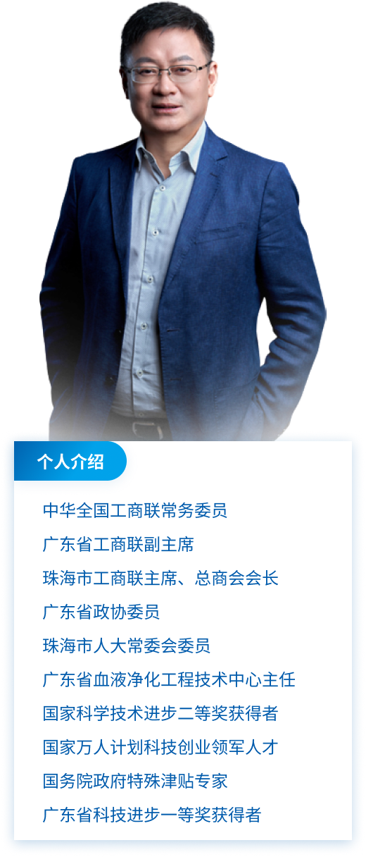 创新创业二十余载,个人荣获国家科学技术进步二等奖、广东省科技进步一等奖、天津市科技进步二等奖、珠海市科技进步一等奖、珠海市自主创新促进奖等多项殊荣;曾先后作为项目负责人承担国家产业振兴和技术改造项目、国家重大科技成果转化项目、国家十二五科技支撑计划项目、国家揭榜挂帅项目及广东省战略性新兴产业核心技术攻关项目等研发工作。