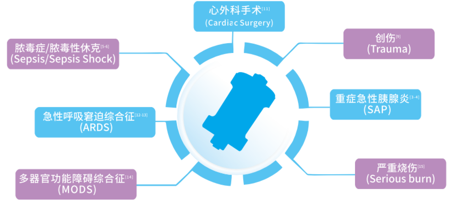 重症患者机体受到感染之后,炎性反应呈级联式放大,而人体为对抗炎症反应而形成的代偿性反应综合征,一旦患者发生全身性炎性反应与代偿性抗炎反应紊乱,可以导致其体内的环境稳态被破坏,出现组织损伤,最终出现多种器官的功能衰竭[1]。710公海寰宇公司针对不同类型危重症患者提供吸附解决方案,710公海寰宇HA一次性血液灌流器,原研经典,广谱吸附,有效清除以炎症介质为代表的中大分子,可用于脓毒症[2-3]、重症急性胰腺炎(SAP)[4-5]、急性呼吸窘迫综合征(ARDS)[6-7]等炎症因子相关性疾病及心外科手术患者[8];CA330细胞因子吸附柱,中国首个获批医疗器械注册证的细胞因子吸附类产品,专用于脓毒症患者炎症早期或细胞因子风暴期。血液吸附危重症领域治疗模式多样,临床上可以根据实际情况单独灌流使用,也可与其他血液净化模式联合使用,如HP+HD/HDF/CVVH、PFAD/CPFA[17]、(PFAD-HD)/ CPFA-CRRT[17]、HP+CPB、HP+ECMO,进行全血或者血浆灌流治疗。